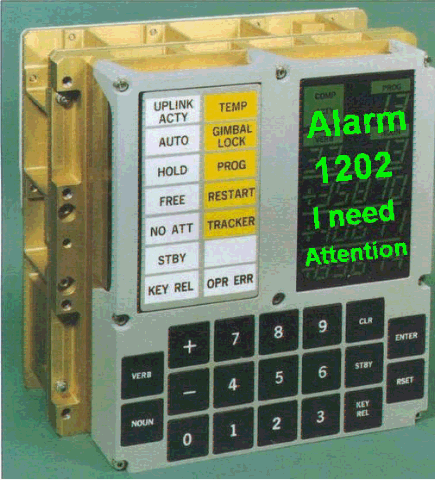 Vu la fréquence des redémarrages de l'ordinateur d'Apollo, cela signifiait qu'il ne serait pas longtemps avant que le système de doublage ne prenne le contrôle de l'avion, et que l'avion soit contrôlé par les calculateurs analogiques au lieu de l'ordinateur d'Apollo lui-même. |