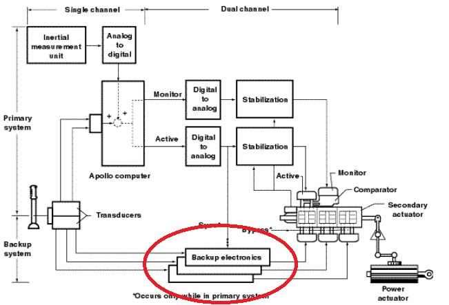 En effet, l'ordinateur d'Apollo avait quelques particularités qui étaient plutôt embarrassantes, comme cet extrait le montre: "A nervous flight director received assurances from the computer specialists in a room adjacent to Mission Control that the restarts, though irritating, were normal. Draper wanted to allow three restarts in the F-8 before the digital channel was declared failed. As it turned out, this could take up to one second, which was extremely long for a high-speed airplane. Thus, the requirement was changed; Any one failed restart would cause a switchover to the Backup Control system." Soit: "Un directeur de vol stressé reçut des assurances des spécialistes informatiques, dans une pièce adjacente au contrôle de mission, que les redémarrages, quoique irritants, étaient normaux. Draper voulait autoriser trois redémarrages dans le F-8 avant que le canal digital ne soit déclaré en panne. Il s'avérait que cela pouvait prendre jusqu'à une seconde, ce qui était très long pour un avion à haute vitesse. Le cahier des charges fut donc changé; tout échec de redémarrage entrainerait la prise de contrôle par le système de doublage (i.e. les calculateurs analogiques)". |