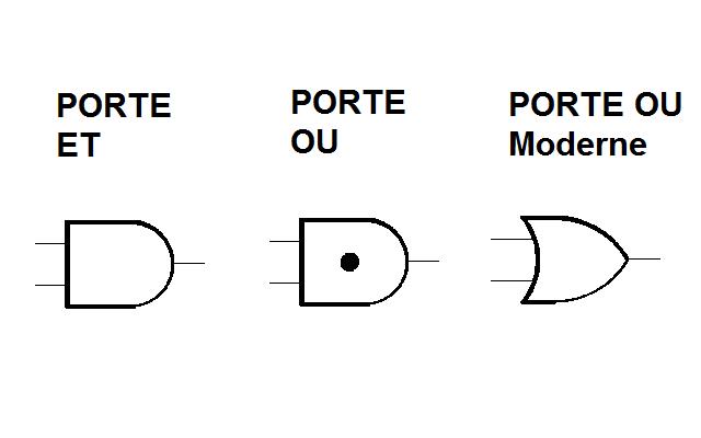 Une porte OU est un circuit qui a plusieurs entrées (au moins deux), et dont les sorties sont à 1 si au moins l'une des entrées est à 1, et 0 seulement si toutes les entrées sont à 0. |