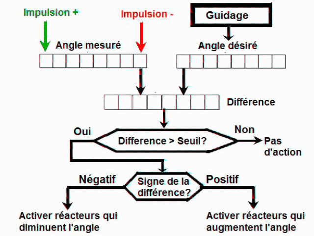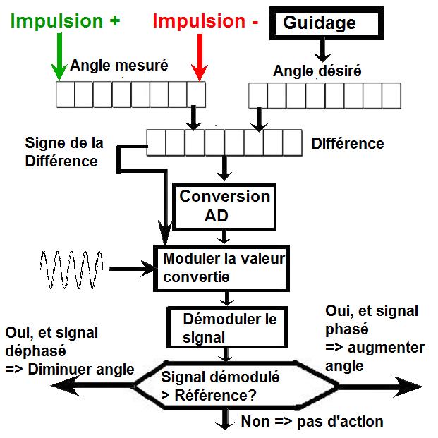 ![]() Maintenant, ce qu'ils font est un peu différent. Ils calculent la différence entre ces deux valeurs de l'angle dans un compteur, et ils convertissent cet angle en une valeur analogique avec un convertisseur digital vers analogique; la valeur analogique convertie module un signal haute fréquence, et la phase de ce signal est mise suivant le signe de la différence. Puis ce signal modulé est démodulé, et le signal démodulé est comparé avec une référence; si le signal démodulé est au-dessus de la référence, les réacteurs qui font augmenter cet angle sont activés si le signal modulé est phasé, et inversement les réacteurs qui font diminuer cet angle sont activés si le signal modulé est déphasé; si le signal démodulé est sous la référence, aucun réacteur faisant changer cet angle n'est activé. C'est inutilement compliqué, il est bien plus simple de procéder comme je l'ai précédemment montré, en comparant simplement la différence des angles avec un seuil binaire, et d'activer des réacteurs si la différence est au-dessus du seuil suivant le signe de la différence. La conversion de la différence des angles en une valeur analogique aurait seulement eu un sens si la poussée des réacteurs latéraux avait pu être ajustée; dans ce cas, la valeur analogique convertie aurait pu être utilisée pour ajuster la poussée des réacteurs latéraux. Mais, comme leur poussée ne peut être ajustée, et qu'ils fonctionnent en "tout ou rien", i.e. ils peuvent être soit complétement activés, soit pas du tout, mais pas partiellement, la conversion de la différence d'angle dans une valeur analogique est une complication inutile. Il ne peut pas être dit que cette manière de faire est complètement impossible, mais est une complication inutile, en des ingénieurs ayant l'intention de faire un projet sérieux ne feraient jamais des complications inutiles. |