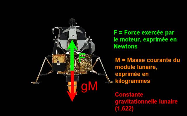 ![]() De manière à rester au-dessus de la surface lunaire, à altitude constante, le moteur du module lunaire doit parfaitement compenser l'attraction lunaire. L'attraction lunaire exerce sur le module lunaire une force vers le bas qui est égale à la constante gravitationnelle lunaire (que j'appellerai "g") multipliée par la masse courante du module lunaire (que j'appellerai "M"), exprimée en kilogrammes, cette force étant exprimée en Newtons. Le module lunaire doit donc produire une force (que j'appellerai "F") qui est égale à cette force vers le bas, de sorte que le module lunaire ne tombe pas vers la lune. |