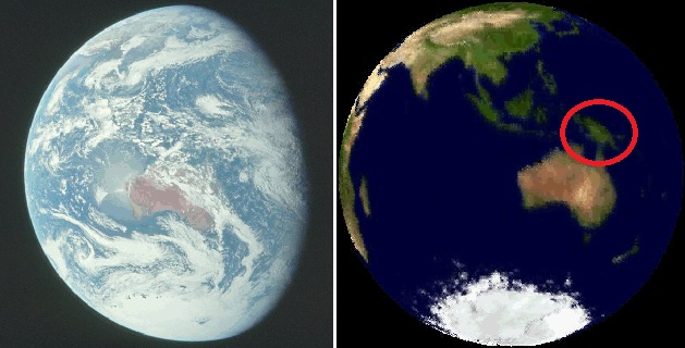 ![]() We should at least see New Guinea, I have circled on the real view. It can't be entirely hidden by clouds. We can see the blue of the sea where it should be. |