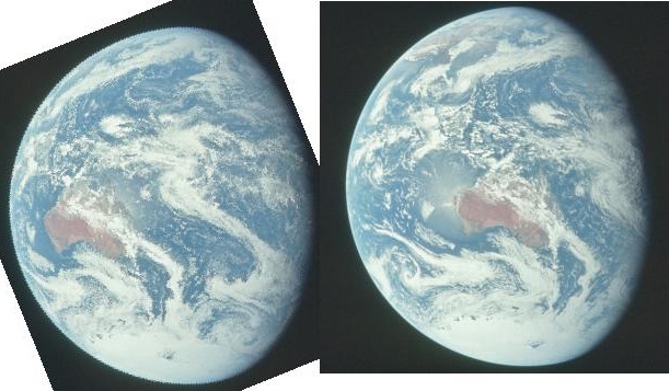 ![]() The comparison is made easier if we turn the first photo so that the two earths have the same orientation. We can see that Australia has moved right, which is normal because of the time lapse between the two photos (and the quantity of the move corresponds to the difference of time). But we can see that Australia has the same shape and orientation on the two photos. |
