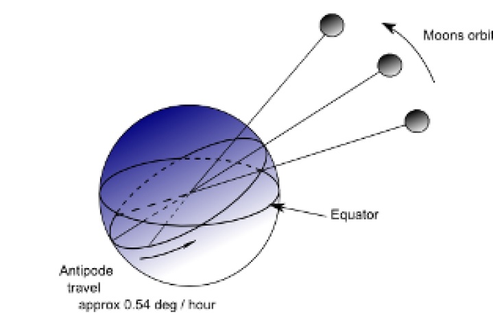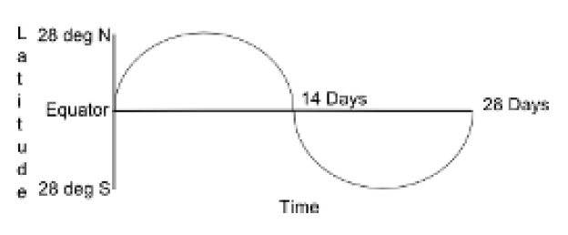 ![]() Le document montre un graphe représentant la direction de la lune relativement au plan équatorial comme une sinusoïde d'amplitude 28° (l'angle antre le plan orbital de la lune et le plan équatorial de la terre). |