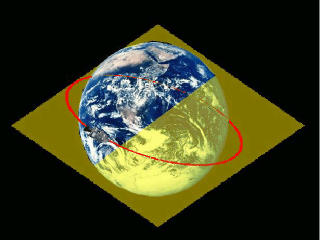 ![]() En fait, de manière à convertir cette vitesse en vitesse radiale, nous devons la projeter sur la direction radiale (la direction vers le centre de la terre), en multipliant cette vitesse par le cosinus de l'angle que fait la direction du vaisseau spatial avec la direction de la terre. |