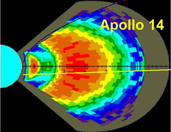 ![]() Et, si nous comparons Apollo 11 (sur la gauche des graphes) avec Apollo 17 (sur la droite des graphes), nous voyons qu'Apollo 17 a une durée substantiellement plus petite que pour Apollo 11, ce qui signifie qu'il est descendu plus rapidement, des paramètres de chauffe plus élevés, ainsi qu'une dose de radiation plus élevée, ce qui est compatible avec une descente plus rapide. Mais, alors que nous nous attendrions à ce qu'Apollo 17 ait un g maximum plus élevé que celui d'Apollo 11, il a illogiquement un g maximum un peu plus petit! On peut trouver d'autres incohérences dans cette table, ce qui jette un sérieux doute sur ces rentrées. |