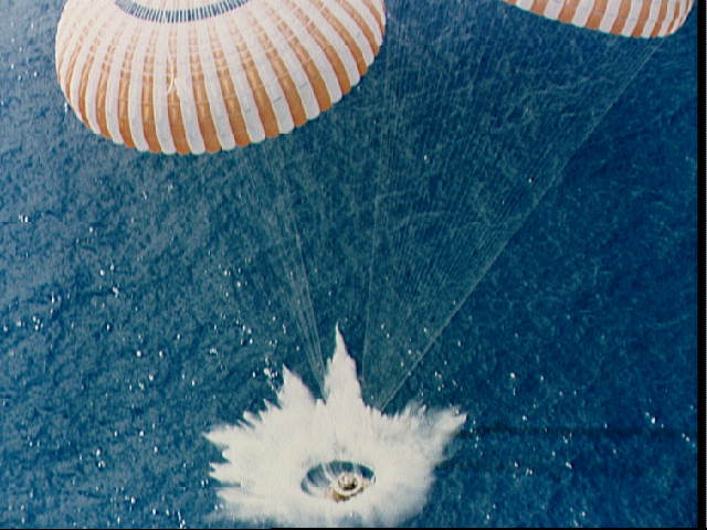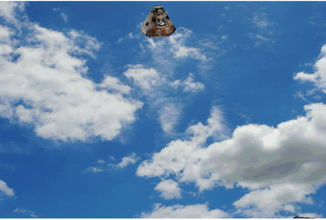 Ceci est une animation que j'ai faite avec le module de commande tombant dans l'océan dans la mission Apollo 11. Le module de commande flotte initialement sur ses flotteurs, ce qui est normal. Mais, étrangement, il se retourne ensuite, et, quoique ses flotteurs soient maintenant en haut, et hors de l'eau, il s'enfonce à peine dans l'eau, comme s'il avait une structure très légère. |