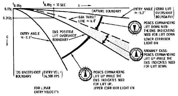 ![]() L'angle de rentrée, "flight path angle", est l'angle sous lequel le vaisseau spatial pénétre dans l'atmosphère. Il est évident que, plus cet angle est important, et plus le module de commande descendra rapidement. Toutefois, cet angle ne doit pas dépasser une certaine limite, sinon la vitesse de descente serait telle qu'elle causerait une surchauffe fatale du module de commande. g représente l'accélération de la chute du module de commande, et le g maximum la valeur maximale de cette accélération. Tout le monde comprend que, plus un corps accélère, plus il gagne de la vitesse, et donc moins il prend de temps pour couvrir une distance donnée. Et aussi, plus vite le module de commande tombe, et plus il chauffera et encaissera des radiations. Et aussi, plus l'angle de rentrée est important, et plus vite le module de commande descendra. Donc pour résumer: Angle de rentrée plus important = g maximum plus grand, durée de chute plus courte, plus de chauffe et de radiations. |