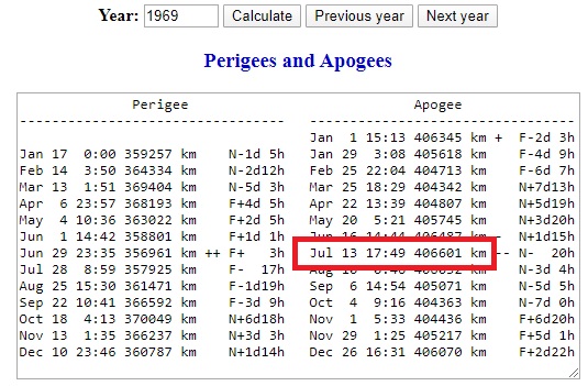 ![]() Encore plus intéressant, lorsque j'ai regardé l'apogée précédant Apollo 11, j'ai trouvé qu'elle s'est produite le 13 juillet, soit 6 jours avant que le module de commande n'atteigne la lune. |