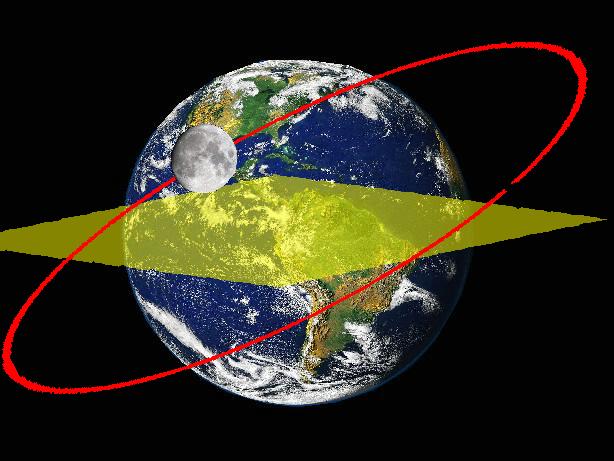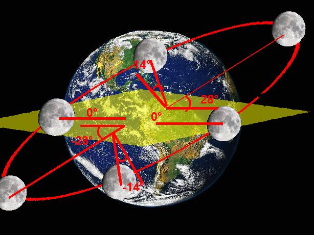 ![]() Le plan orbital de la lune fait avec le plan ecliptique (le plan de l'orbite de la terre autour du soleil) un angle de 5° qui est à ajouter à l'angle que le plan écliptique fait avec le plan équatorial de la terre aui est 23°, soit au total 23+5=28°. |
