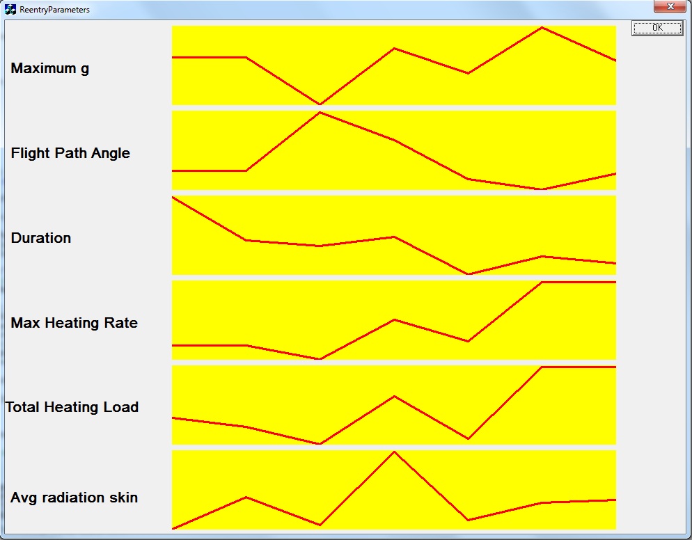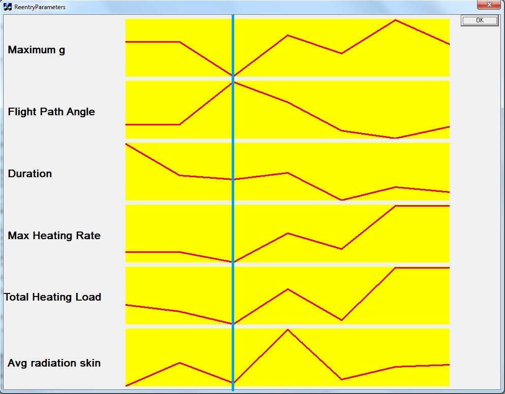 ![]() Les paramètres de rentrée ne sont pas aisés à étudier lorsque directement lus dans la table. C'est pourquoi je les ai représentés sous la forme de graphes superposés. Pour chaque graphe, l'ordonnée la plus basse correspond à la valeur minimale du paramètre, et l'ordonnée la plus élevée à la valeur maximale du paramètre. L'axe horizontal correspond aux missions Apollo 11 (sur la gauche) à Apollo 17 (sur la droite). |