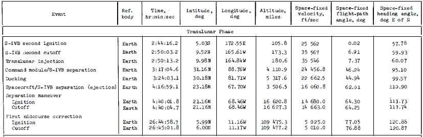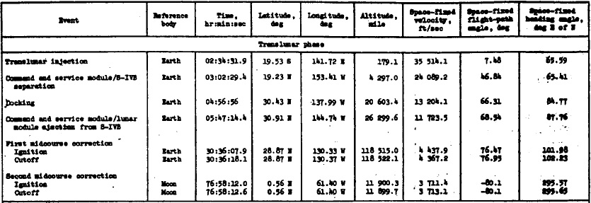 ![]() Ceci est la table de paramètres pour Apollo 12 (montrée à la page 5-5 du rapport de mission). L'injection translunaire est faite à une latitude de 15,83° nord, et une altitude de 192.1 milles (356 kilomètres), et la première correction de mi-course est faite à une latitude de 1,108° Nord, et une distance de 116929 milles (216552 kilomètres). |