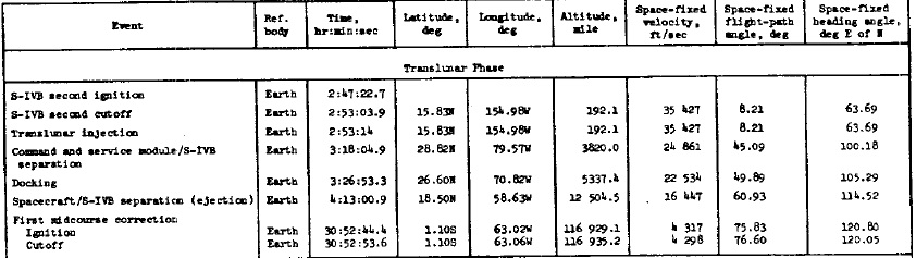 ![]() Maintenant, nous trouvons encore plus d'incohérences dans cette table que dans les tables précédentes. La latitude du point de séparation du module de commande du S-IVB est de 19,23 Nord, ce qui signifie que le S-IVB l'aurait envoyé dans une direction qui est encore plus fausse que dans les missions précédentes. Et, après, le module de commande aurait été envoyé nettement au-dessus du plan équatorial, alors qu'il était parti en-dessous (à l'injection translunaire), il aurait été envoyé plus près du plan équatorial, car la latitude a deuxième correction de mi-course est 0,56° nord; ce n'est certainement pas une trajectoire optimisée! Entre la séparation du module de commande du S-IVB et l'arrimage du module de commande au module lunaire, il y a presque deux heures (une heure et 54 minutes). Pourquoi autant de temps alors que les missions précédentes n'ont eu besoin que de quelques minutes? |
