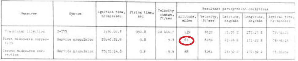 ![]() Finalement, ceci est la table de paramètres pour Apollo 14 (montrée à la page 6-4 du rapport de mission). L'injection translunaire est faite à une latitude de 15,83° Sud, et une altitude de 189,1 milles (332 kilomètres), et la première correction de mi-course est faite à une latitude de 28,87° Nord, et une distance de 118515 milles (218490 kilomètres), ce qui signifie que le module de commande croiserait le plan équatorial pendant son voyage. |