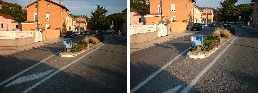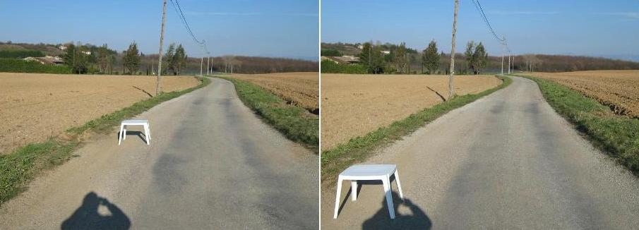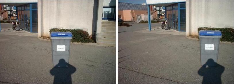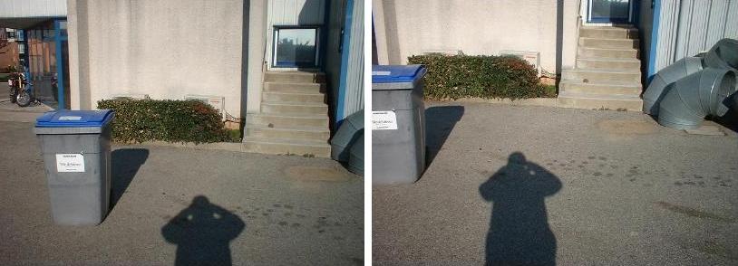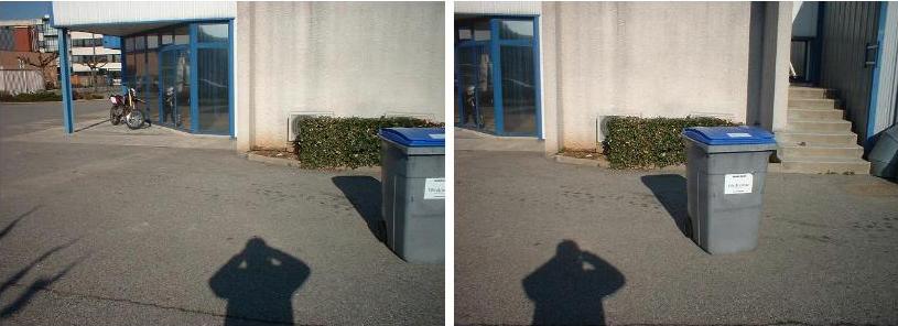 Sur la vue stéréoscopique de la figure 30, l'ombre de la poubelle est maintenant proche de l'horizontale; mais mon ombre n'y est pas visible, et elle n'a aucune chance de l'être, car je montre sur la photo de droite où elle se trouve: J'ai du substantiellement tourner mon appareil pour la trouver.