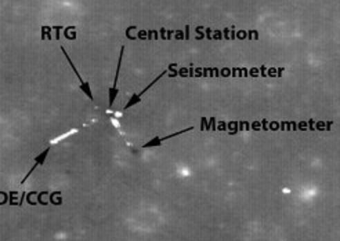 ![]() This LRO picture gives in legend the meaning of the various brilliant spots we see. ![]() This is a part of a photo of the mission Apollo 12. On it we can see the seismometer and the central station. ![]() I have circled in green the brilliant spot which is indicated on the LRO photo as being the central station, and in blue the brilliant spot which is indicated on the LRO photo as being the seismometer, but what is the still bigger spot which is close to the latter spots and that I have circled in red? |