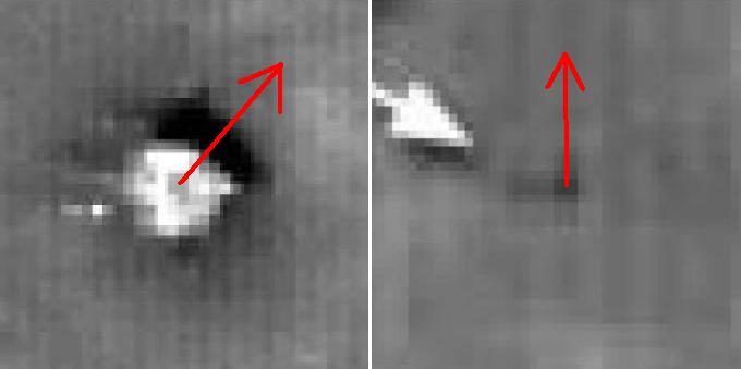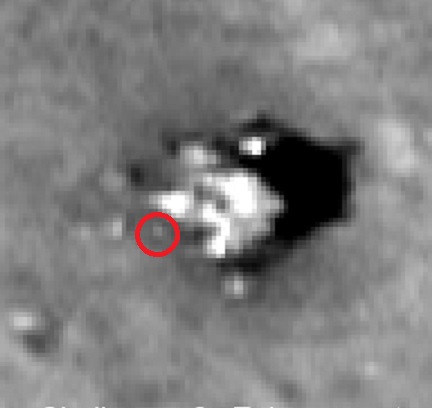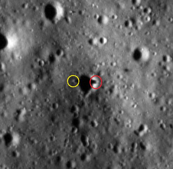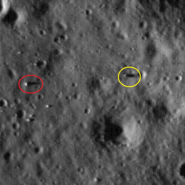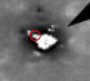 If we take a bigger part of the original satellite photo, we can see another object (I have circled in red) which looks like the lem (I have circled in yellow), and which creates the same type of shadow. If the first object is the lem, then what is the second object? ![]() |