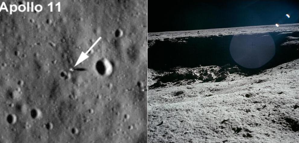![]() The photo on the left of this double view is extracted from a video of Apollo 15 after the ascending stage of the lem has left the moon; the photo on the right is a close-up of the supposed remaining part of the lem on a LRO picture (the white we see comes from an arrow pointing at the lem); the shadow we see on the LRO picture doesn't correspond at all with the shape of the lander; moreover, the shadow of the lander should be not be so much longer than wide, except if the sun is extremely low, razing the ground; but in that case the holes we see on the LRO picture would not be partially lit, they would appear completely blackened. |