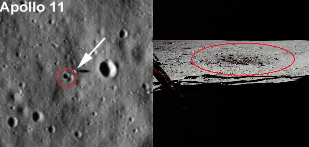 Near the lem, we can see a hole on an Apollo photo (AS11-40-5861); but we don't see this hole on the satellite photo. In fact we can see a hole near the lem on the satellite photo, but it nothing looks like the hole on the Apollo photo, and nowhere it can be found on the Apollo photos. ![]() |