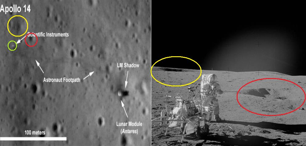 And if we compare the position of the scientific instruments (MET) relatively to two holes which are close on this Apollo photo (AS14-68-9405) and on the satellite photo, we can see it is different. On the satellite photo, the scientific instruments are closer to the hole which is the farther one (from the lem) than on the Apollo photo. On the Apollo photo, you can also see that the shadow of the bar the astronaut is holding is not visible! ![]() |