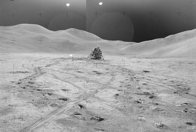 If we compare the satellite photo with this view of the lem, with the hills in the background (AS15-82-11057), we can see that it's completely different. Where are the holes of the satellite photo on the Apollo photo? And where are the hills of the Apollo photo on the satellite photo? Some have told me that what I call "hills" is in fact "mountains" and that they are much farther away; but we see photos of these "mountains" some photos before, and they appear twice higher; that means that, between these photos and the photo I show, the rover would have covered a distance which is greater than the total distance which has been covered by the rover during the whole mission. ![]() Here is a wider view of the panorama of the photographic mission of Apollo 15 made with two adjacent photos (AS15-82-11056 and AS15-82-11057) ![]() |