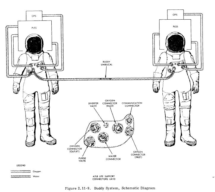 ![]() They also say that, in case that the water or oxygen flow fails for an astronaut, he can share the water or oxygen of the other astronaut with a connection which is shown on this schema, and called "buddy system" (water or oxygen), and which is 2.7 meters long. They say that this connection system allows to increase the EVA backpack limit to 2 kilometers. But it makes no sense, for, if an astronaut takes his water or oxygen from the other astronaut, he will drain out twice faster the water or oxygen reserve of the other astronaut than the latter would if he was alone to use it. Why wouldn't there rather have been a reserve of oxygen and water in the rover? Because the astronauts would have to be close to the rover? But they also have to be close to the rover to use the buddy system, for it is obvious that this system is packed in the rover, and that the astronauts are not going to drag it behind them as they are walking around. And, when the problem occurs, it is also obvious that the astronauts are immediately going to return to the lunar module, for they are not going to proceed in the EVA with this degraded situation. |