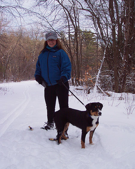 Dori at 1 year old sleeping head to head with her friend 'Blue', a french bulldog, and walking in the snow.