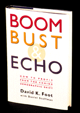 Show the graph of population trends from Boom, Bust and Echo or visit Statistics Canada web-page and target the "bulging" areas of the population. Prepare questions for the students to gather information on population trends. Cater the questions to your own needs (ie concentrating on the Baby Boomers or the Baby Boom Echo Kids or even the Baby Busters)