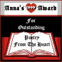 to receive one of my awards and you think your sight qualifies, let me know. I would be happy to visit your sight and present you with an award if your sight meets the qualifications. To qualify for an Anna award you only need a little :) A LITTLE LOVE A LITTLE BEAUTY A LITTLE CREATIVITY A LITTLE HOPE AND INSPIRATION A LITTLE POETRY FROM THE HEART Your sight will qualify if you have any one or combination of the above. Also, you will not be disqualified for having alot of any one or more of the above. Some of the awards will require my name and/or my websight name. Also if you request I can personalize any of the awards with your name or websight name. I hope to hear from you.