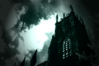 eyes flash in the darkness. A few dog-like forms shift through the shadows