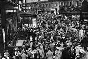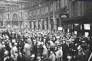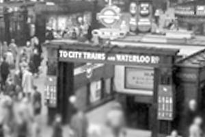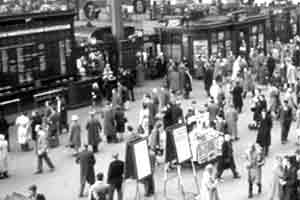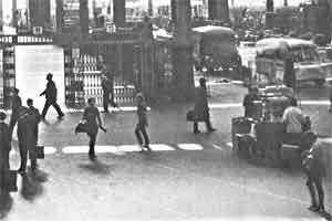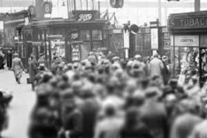 Rush hour: circa 'A long time ago'. Some things never change, as commuters fight each other in the scrum for the home straight. Umbrellas at Five o'clock.