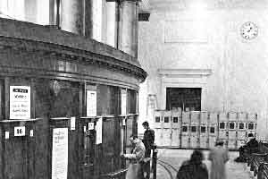 The Windsor Bar, a wonderful Edwardian style saloon where one could prime oneself for the horrors of train travel. First, book your seat with the lady at the ticket booth, and then alight to the bar for a first class Gin & Tonic. Splendid. You can still see most of these features today, retained for the main doorway of Waterloo's Travel Center.