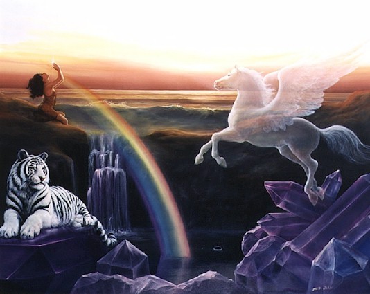 ~As Diana searched for the unicorns She came upon a village filled with creatures who called themselves "humans". They lived humble lives, not filled with much meaning, but Diana could tell they had potential. She mingled amongst them, soaking in their hunger for life, but there was also something horrible about them; they fought amongst themselves so their hidden potential grew even more vague. They didn't realize their Mother was so near to them. ~Diana, for the first time in eternity, saw hate and felt sorrow. Her feelings turned hard and Her jaw became clenched. She saw death and suffering, but at the same time felt a great deep ache. A ache to be understood, to be appreciated by these creatures to whom She'd given so much of Her love and energy. She wondered how She could do this, and decided that at night while Her children slept, She would speak to them. For then, most certainly, they would listen. So She sent energy into their minds and caused them to dream of things better then they had, and when they woke, there was something different about them. They were happier.
