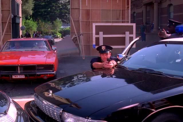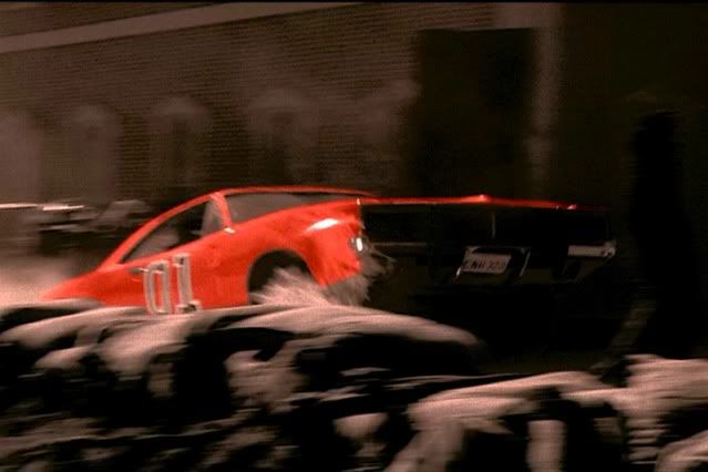 2000 Hazzard in Hollywood: "GL 1"The car's appearance didn't change from 1997-2000. The car wasn't used nearly as much as it was during the 1997 Reunion. This time, the two nicer cars from '97 took a back seat to John Schneider's General Lee. The car was mostly used as a Stunt car for many of the driving scenes. It even busted through a fake brick wall. One scene that was shocking to see is when GL 1 was jumped towards the end of the movie. Thankfully it was a very small jump and it probably did not do any damage to the car other than maybe a bent front valance. The only bad thing that happened to the car during production is when it's original back glass was busted out for one scene. This glass would have had the car's original "WGL 02" etched into it.