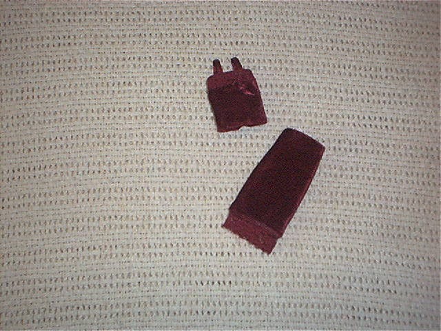 This is a dollhouse miniature ladies 2 piece set. The cami top and skirt are done in burgundy velvet with lace. $7.00 + shipping. (only 1 set available)SOLD!