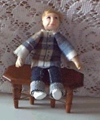 Little Timmy is a child doll with blonde hair and is dressed in a blue plaid shirt and blue jeans. -$18.00