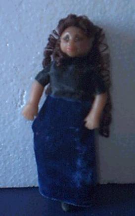 Lorna is a young lady doll dressed in a black top and blue velvet skirt. She has long auburn ringlets.- $22.00 plus shipping.