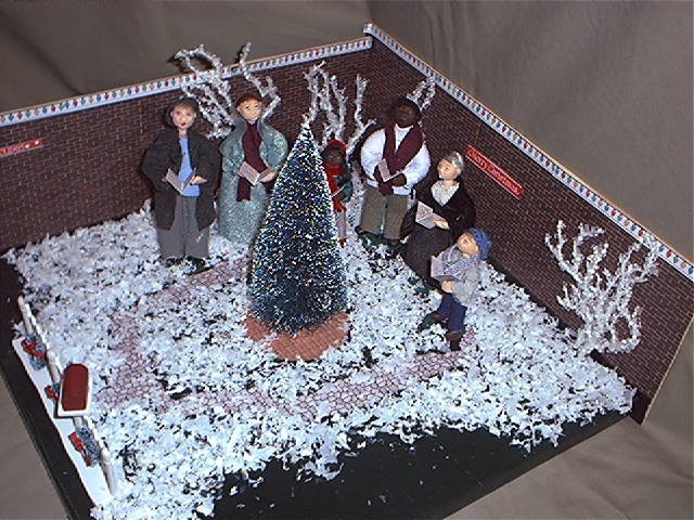This is a Christmas Carollers Roombox i made for the holidays. The display board is just a smooth board that i put sides on. Then i added printable brick to the walls. The Christmas tree is a cheapie from Michael's Craft Store. The ice covered trees are cut from some kind of floral arrangement piece and glued in the corners. I made each of the carollers from polymer clay and dressed them in warm clothing. The Christmas music was printed out on cardstock and cut to fit their tiny hands. I bought the bag of snow from the craft store and glued to the board.