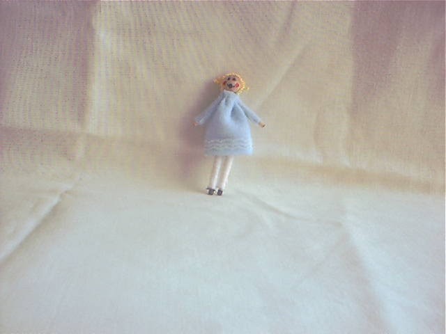This is a tiny 2 inch dollhouse doll's doll. This dolly would look great in a little girls room or a toy store. She is dressed in a light blue dress w/white lace. She has blond curly hair w/pigtails. $9.00 plus shipping.