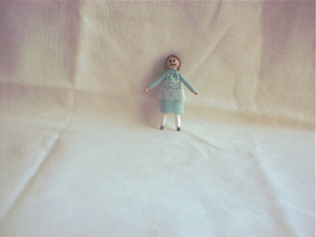 This is a tiny 2 inch doll's doll for your dollhouse little girls room or toy shop. She is wearing a green dress w/white lace apron. She has short brown hair. $9.00 plus shipping.