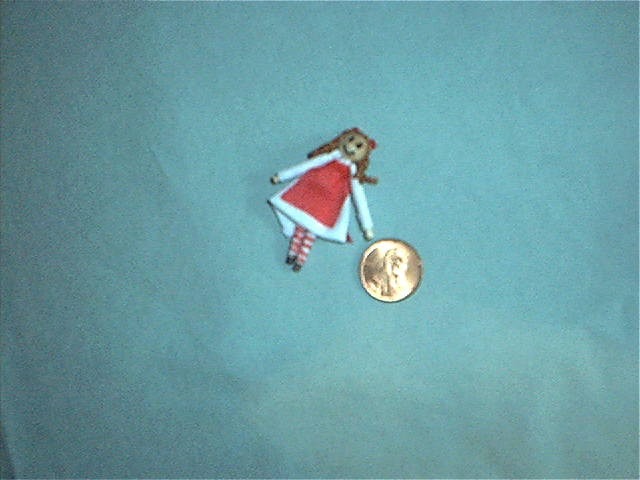 a tiny dollhouse miniature dolls' doll. This doll is a mere 1 3/4th inch high. She is dressed in a white dress with a red apron and red/white striped stockings. She has reddish-brown hair w/a bow. Would look great in your dollhouse little girls room. $9.00 plus shipping.