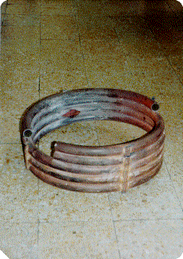 La figura 1. muestra el elemento a analizar, consiste de un tubo de un serpentín de sobrecalentador que falló luego de haber operado durante una hora. Las zonas adyacentes a la superficie de falla se encuentran recubiertas por capas negras posiblemente películas de oxido o productos de la decarburización del acero. Se observa además que la zona posterior del serpentín (que coincide con la parte posterior a la zona de falla) se encuentra soldada a una lamina que mantiene los diferentes anillos que constituyen el serpentín unidos entre sí.