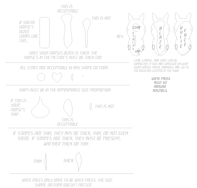 4. The horse in the picture must be the same color as your horse. If your horse is chesnut, the horse in the picture must be chesnut. Try to be accurate in the lightness or darkness of the color, though this will not play a part in the judgement of the horse. Paint or Pinto Horses do not have to have the exact same markings. This includes Paint(Overo), Paint(Tovero) and Paint(Tobiano). Not Paint(Solid). The colors must be the same, yet facial markings are excluded from the judgement of a paint or pinto horse. Horses that have one spot from being paint or pinto must follow by the rules of a regular horse (facial markings included).