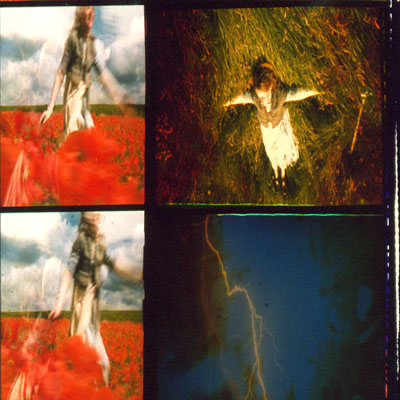 (1.5" x 1.5 ") slide collages used in the performance were projected, videotaped, and then re-projected. |