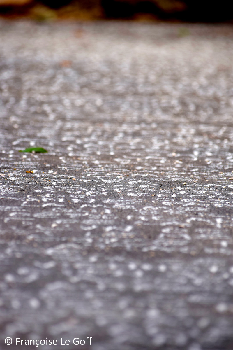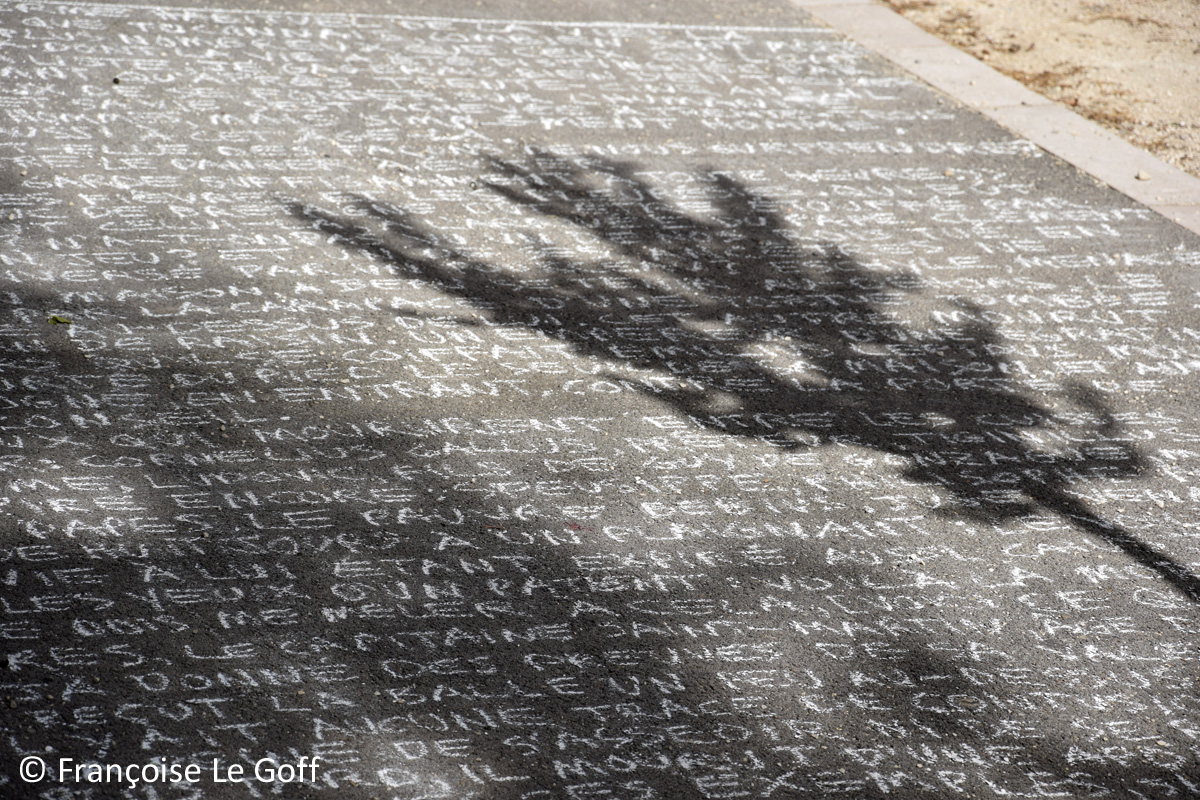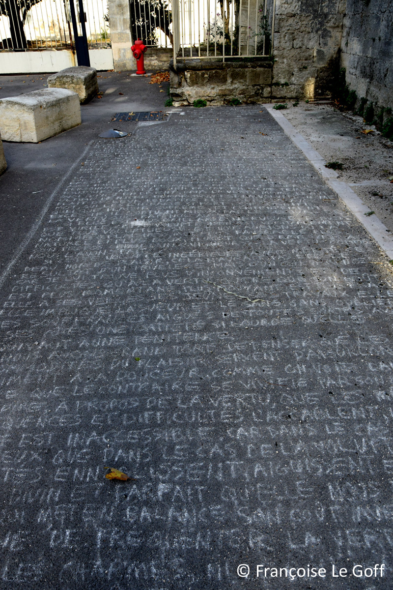 Aujourd’hui je vous présente Philosopher c’est apprendre à mourir, une sélection de trois essais par Michel de Montaigne écrit en craie blanche. Cette installation est une partie de mon projet Les Essais. Michel de Montaigne (1533-1592) a composé 108 essais. En France il existe 101 départements. Pour mon projet Les essais je voudrais tracer un essai de Montaigne, en craie blanche, dans chaque département de la France.