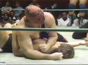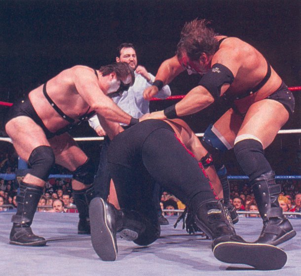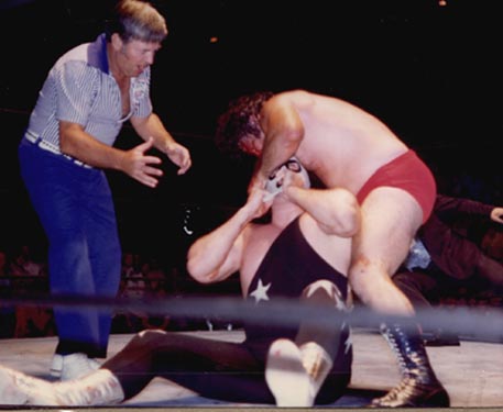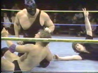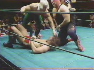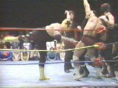 The Masked Superstar and Kim Duk force Dino Bravo back into the corner. 69kb