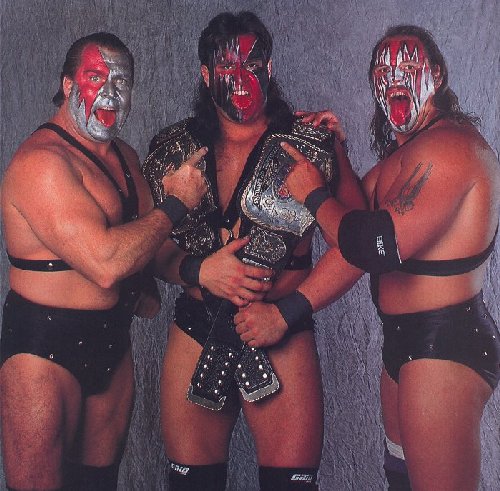 Ax, Smash, and Crush display the WWF Tag Team Championship. 69kb