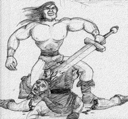 The rest of the Rangers drew their swords and rushed at him. "Prepare to meet your doom, barbarian!" one spat, and Asgarth buried his blade up to its hilt in the man's chest. As he withdrew the blood-smeared weapon, three bodies crumpled to the ground, and Asgarth saw that he had impaled two other attackers behind the first! He laughed as the corpses piled up, pouring gore and death all over the floor and walls of the tavern.