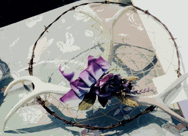 Here is another neat 4 T original. This dream catcher is made of old barbed wire and 3 sun bleached antlers. The antlers join towards the bottom with beautiful ribbon, silk flowers and dried flowers. A beautiful conversation piece that definately gets noticed!!