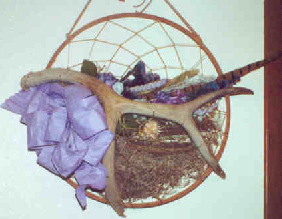 Here is a new item for us, and one that is rapidly becoming popular. We call it our "dream catcher basket." The antler is attached to the "traditional" dream catcher hoop with a dream catcher of it's own, to create a basket apperance. We fill this basket with spanish moss and various feathers, hand painted ceramics, ribbon, dried flowers and silk flowers. The two pictured above are for sale, $35 each.